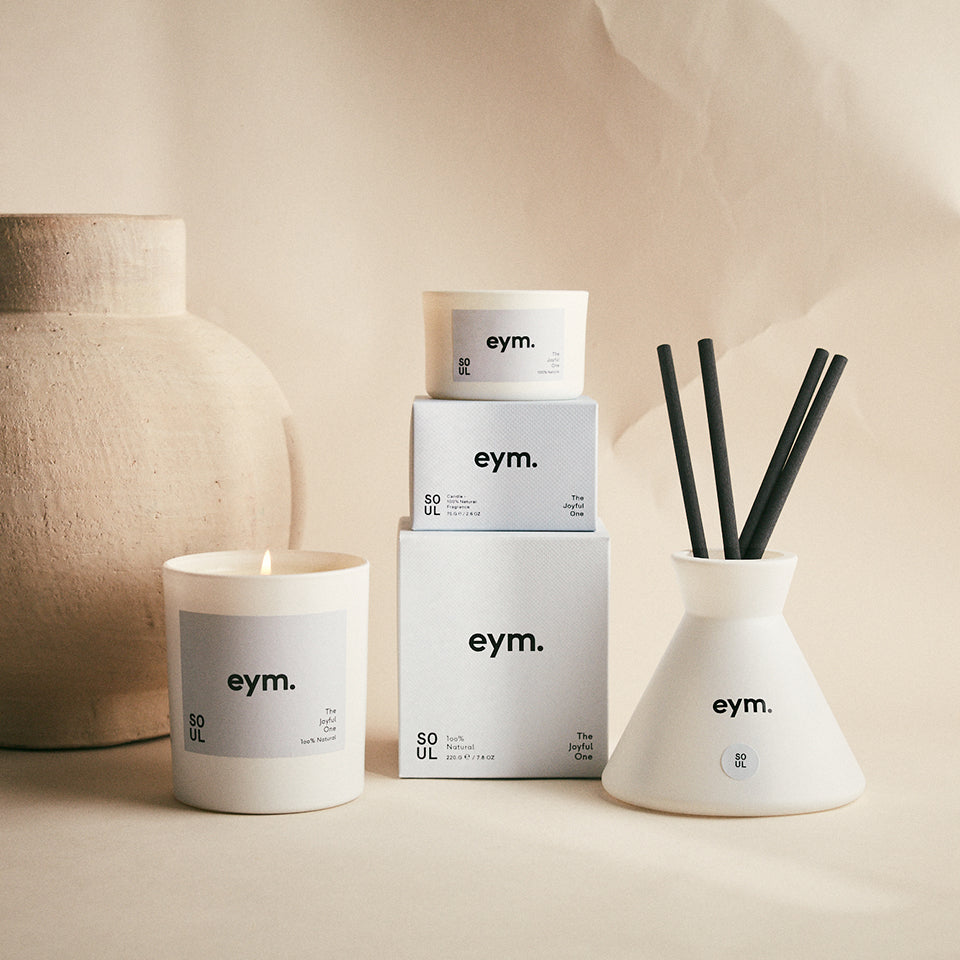 eymの定番アイテム。火をつけると、やさしい精油の香りが空間にふわりと香ります。洗練されたデザインと大きすぎないサイズ感で、インテリアにも馴染みます。